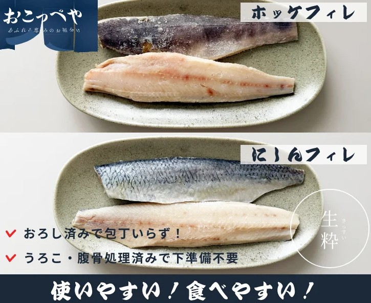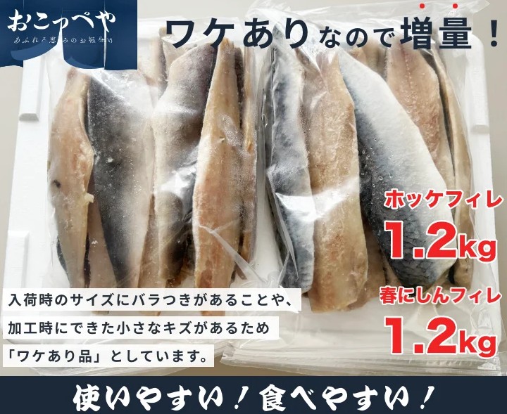 北海道産 ホッケフィレ1.2㎏とニシンフィレ1.2㎏のセット! 混ぜご飯・ムニエル・煮つけ・かば焼き・塩ふり焼きなどお好みで色々な料理にご使用できます。 入荷状況でサイズは大小あります。 3枚おろしフィレ、中骨は除去してありますが、中央にある小骨は残っています。 ジップロック付袋で使いたい分だけ使用し、残りは冷凍保存可能!